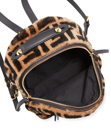 Fendi FF Sheepskin Fur Backpack Flat top handle with conical stud ends. Adjustable chain and...