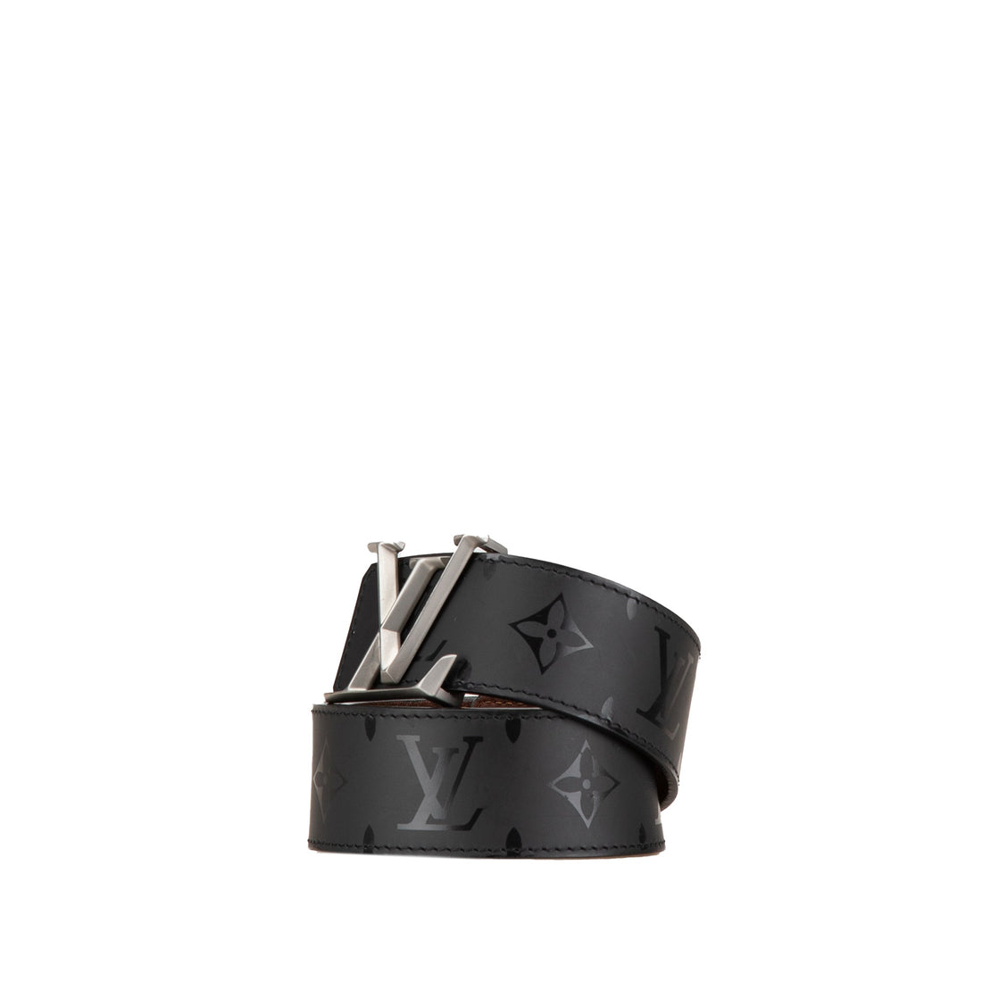 Product Details: Black Louis Vuitton Monogram Eclipse LV Initiales Reversible Belt. This belt features a...