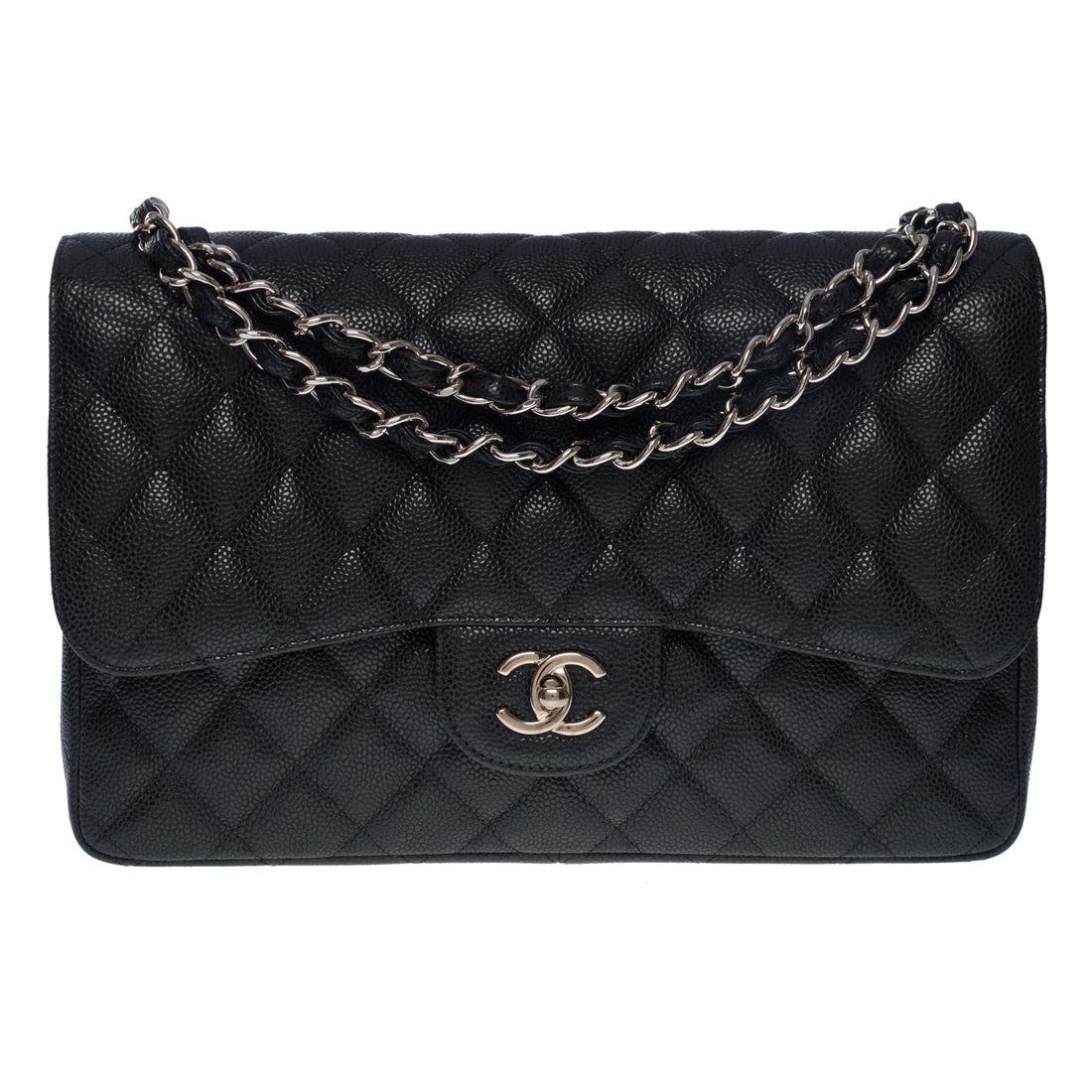 CHANEL Timeless Jumbo double flap bag in black quilted caviar leather, SHW