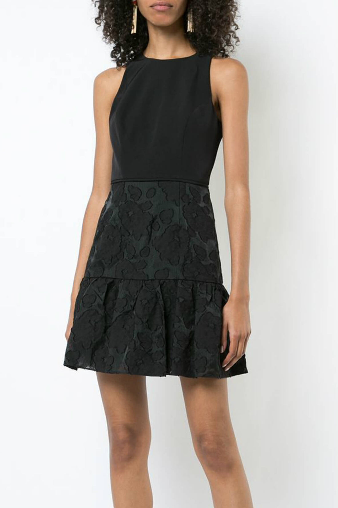 Description The deep green mini dress has crew neck bodice with lace and jacquard skirt...