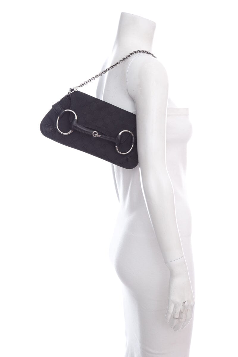 Gucci Black Canvas Monogram Horsebit Handbag. This item is in good condition; very light wear...