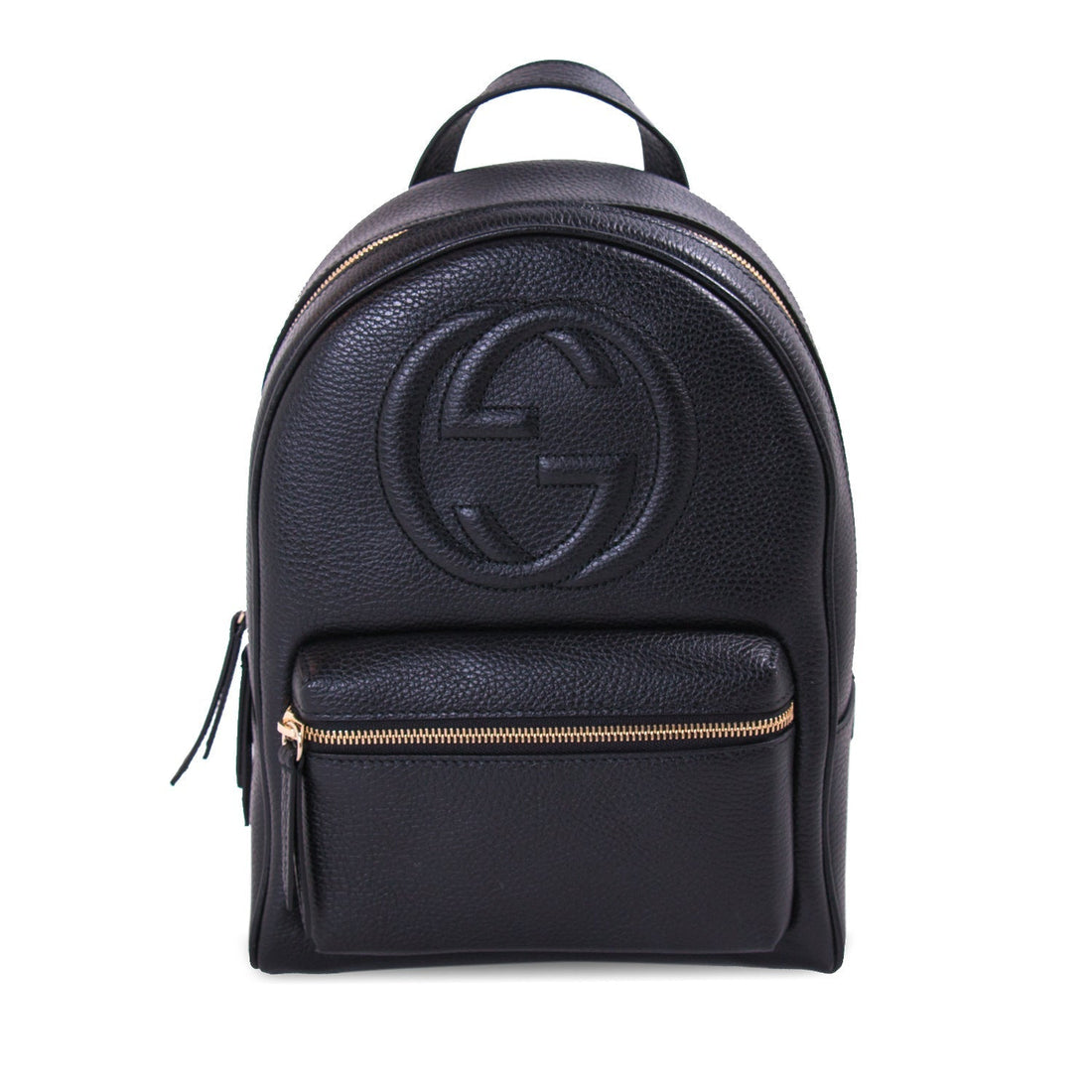 � Description: New Gucci Black�Soho Textured-Leather Backpack Details: Black�Textured-Leather / Gold-Tone Hardware / Embossed Interlocking...