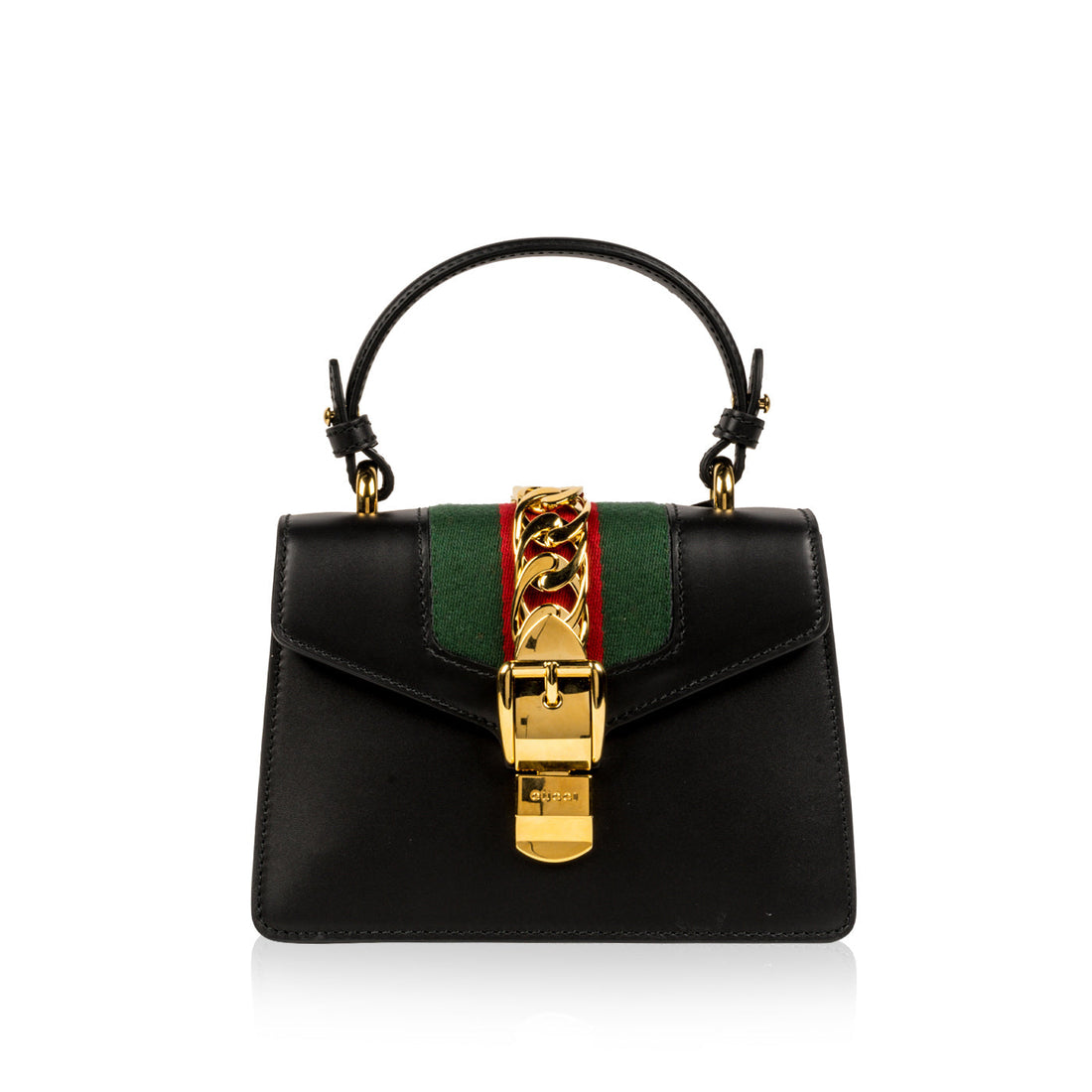 The Gucci Sylvie is regal and timeless; with shined calfskin leather and classic red, green...