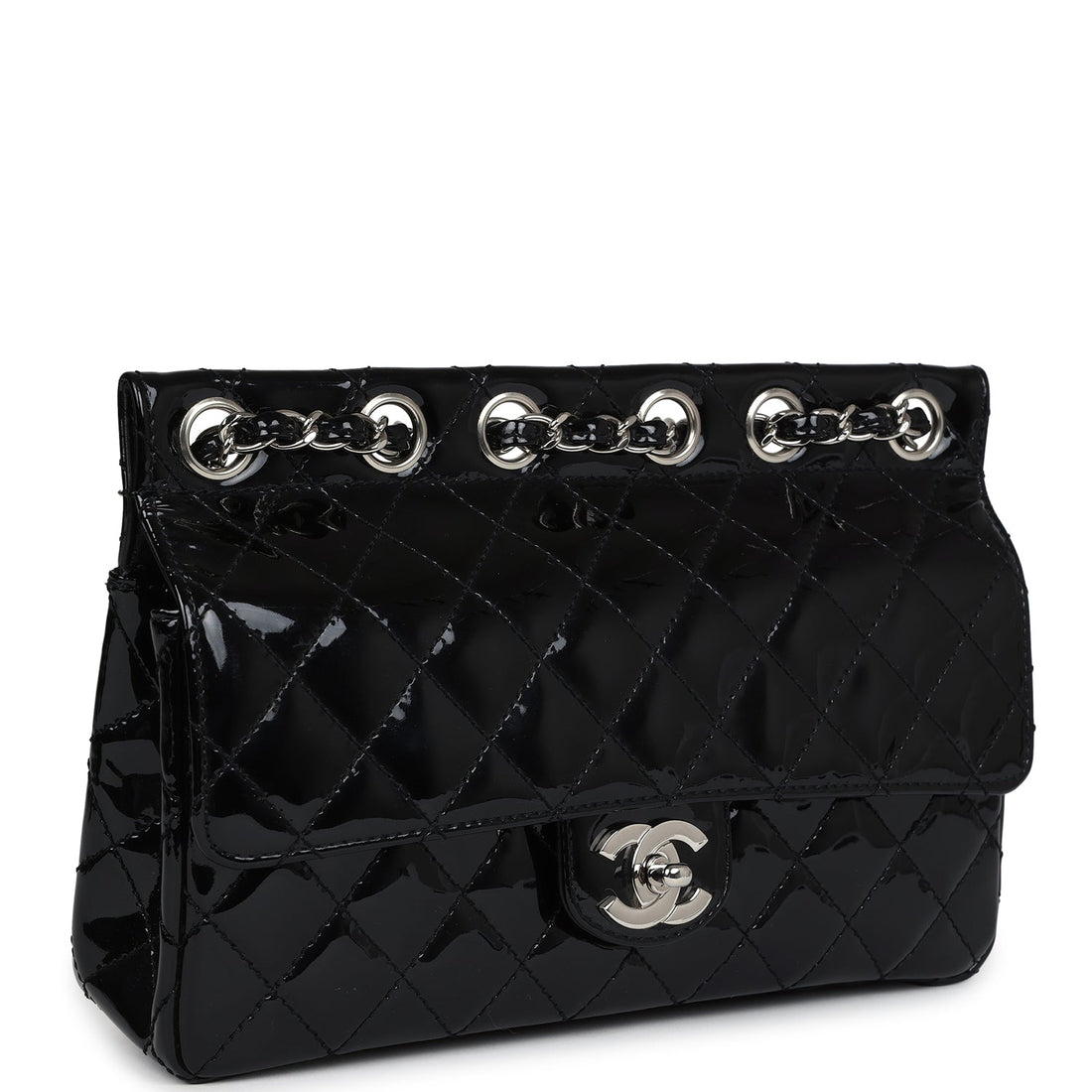 Vintage Chanel Chain Through Flap Bag Black Patent Silver Hardware
