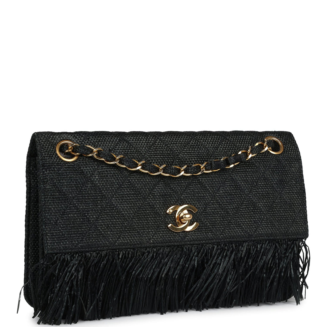 Vintage Chanel Quilted Fringe Single Flap Bag Black Raffia Gold Hardware