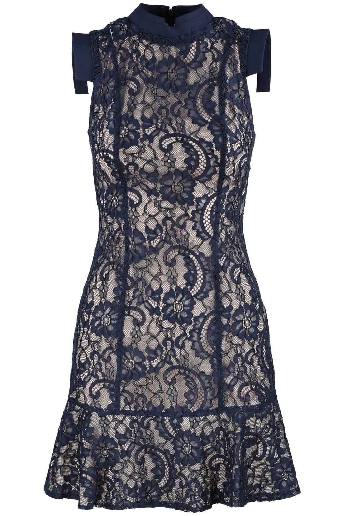 Description Made with a nude lining and dark navy lace overlay, this fit and flare...