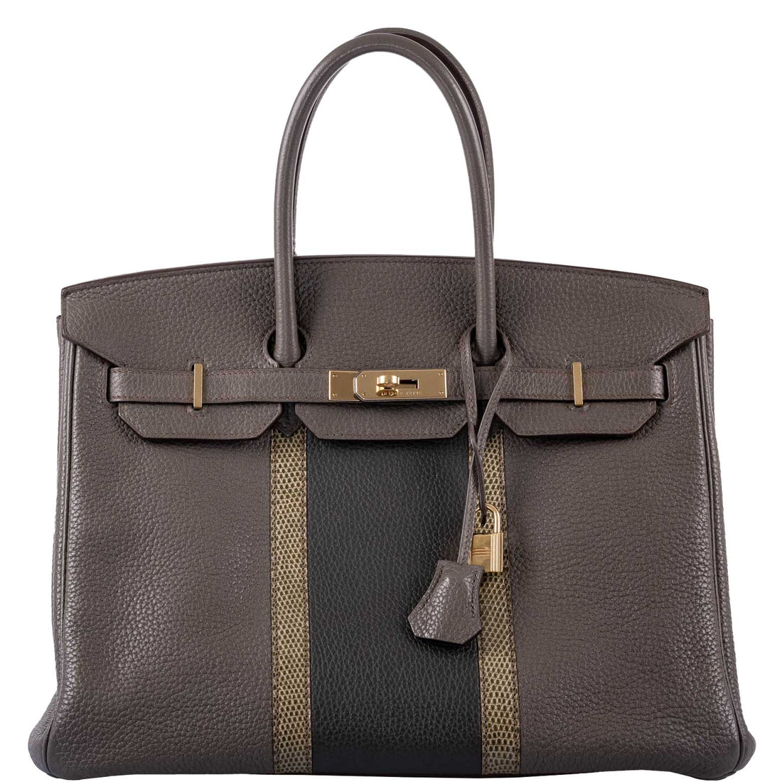 This Hermès Club Birkin Handbag Etain Clemence and Lizard with Permabrass Hardware 35, crafted in...