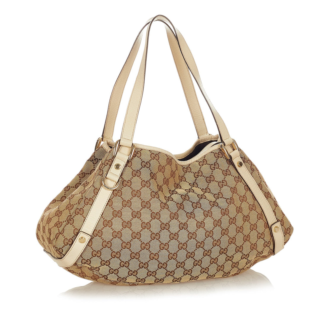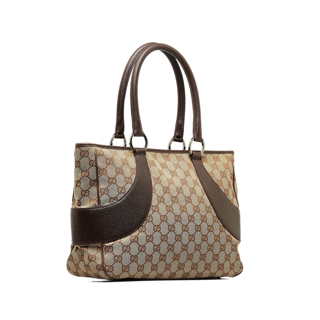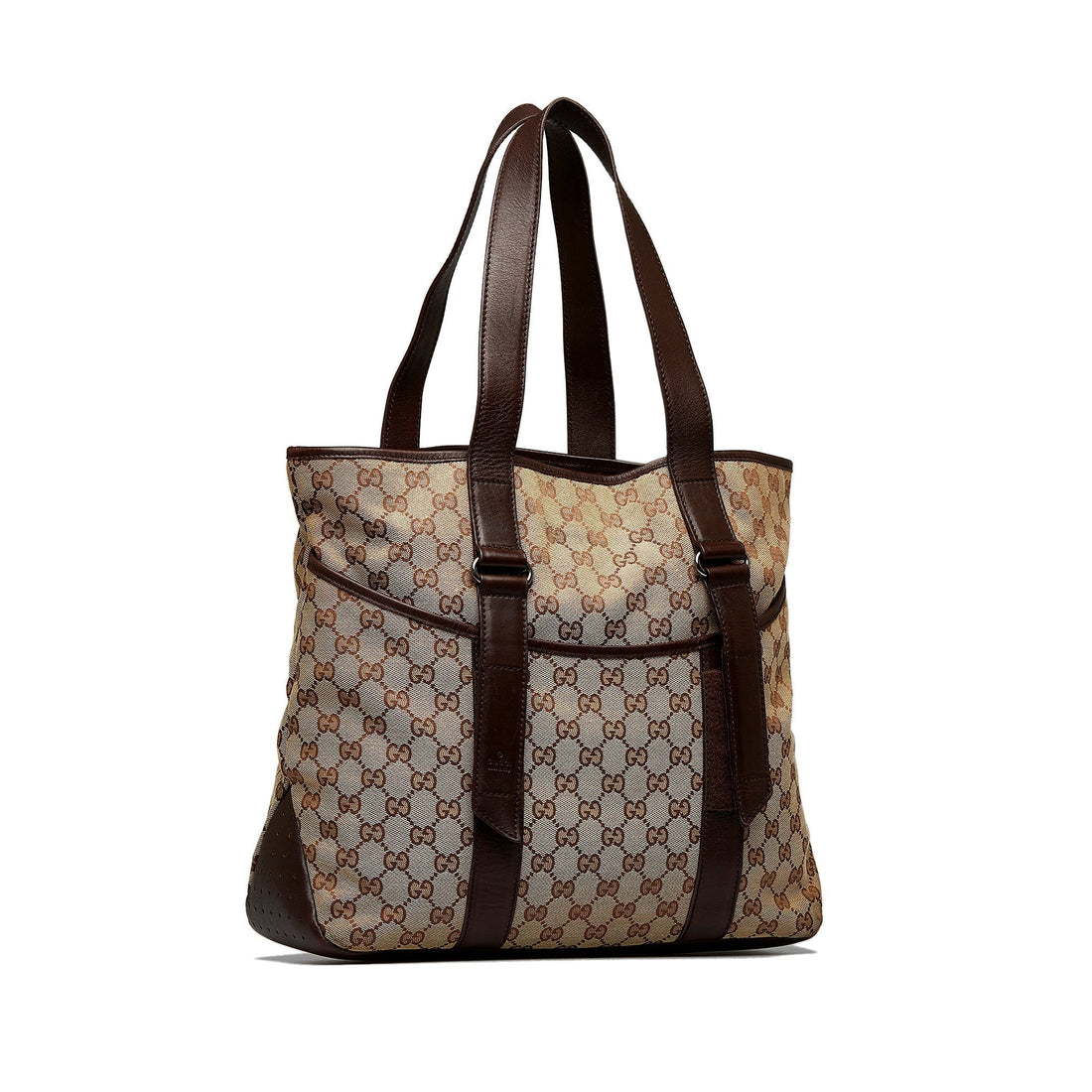 Product Details: Brown Gucci GG Canvas Tote Bag. This tote bag features a canvas body...