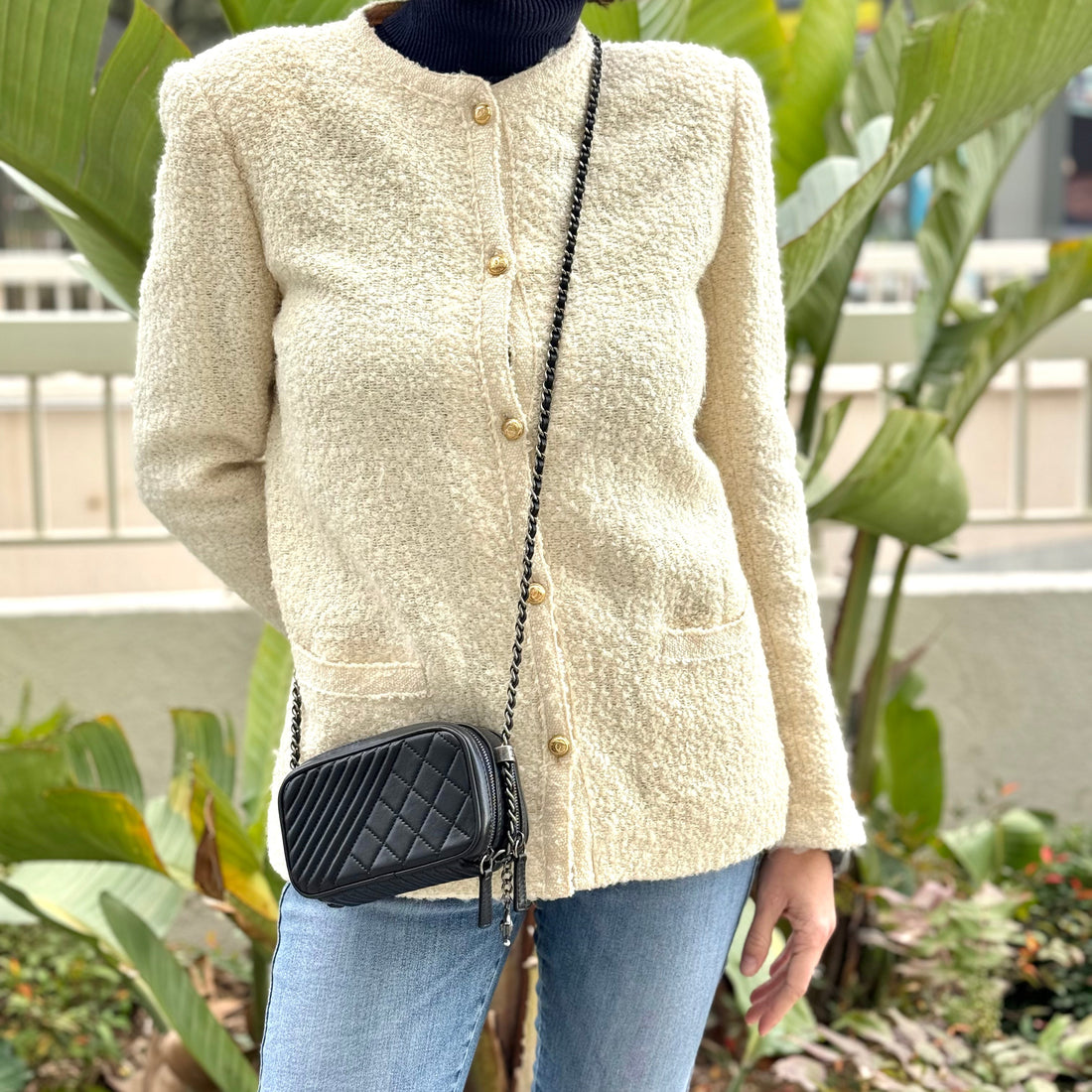 CHANEL - Satin Pearl Medium Boy Flap Black / Ivory CC Shoulder Bag / Crossbody