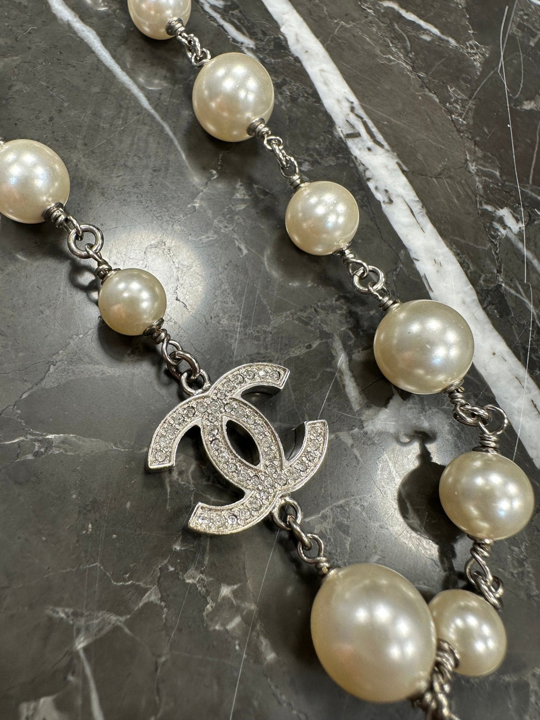 Le sautoir Chanel triple rangs en perles de verre blanches incarne l’élégance intemporelle de la...