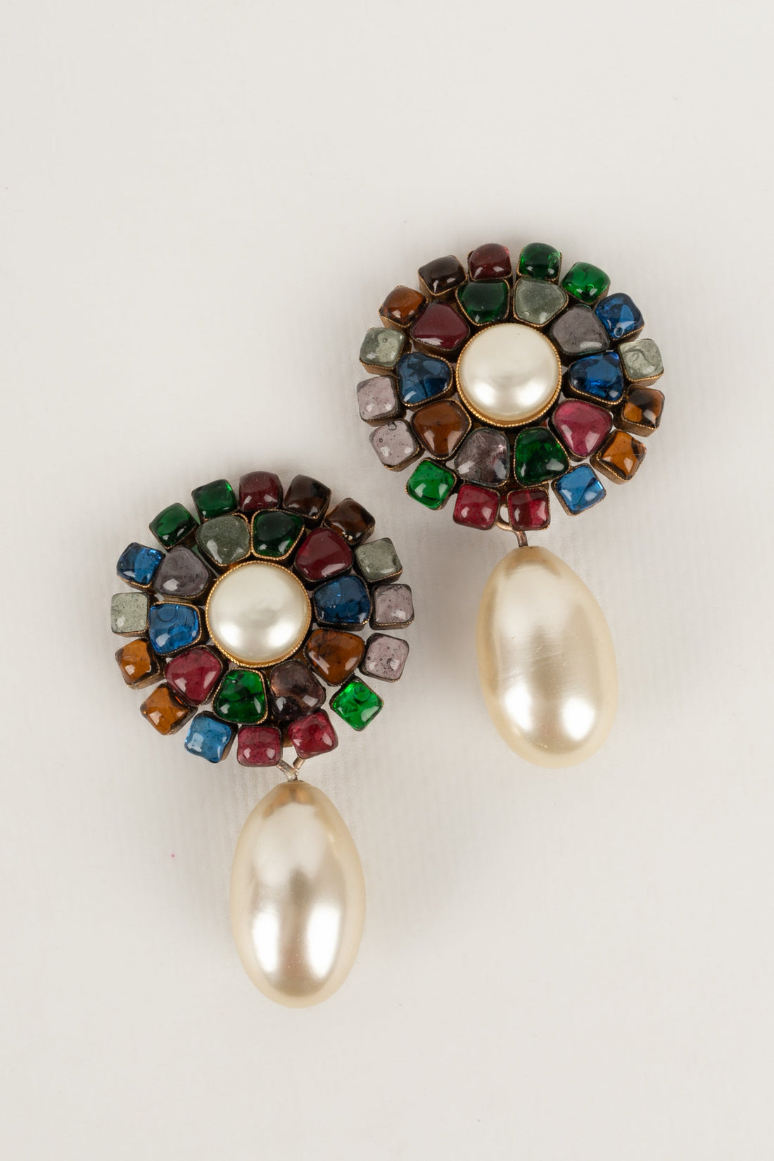CHANEL - (Made in France) Boucles d'oreilles en métal doré et pâte de verre retenant...