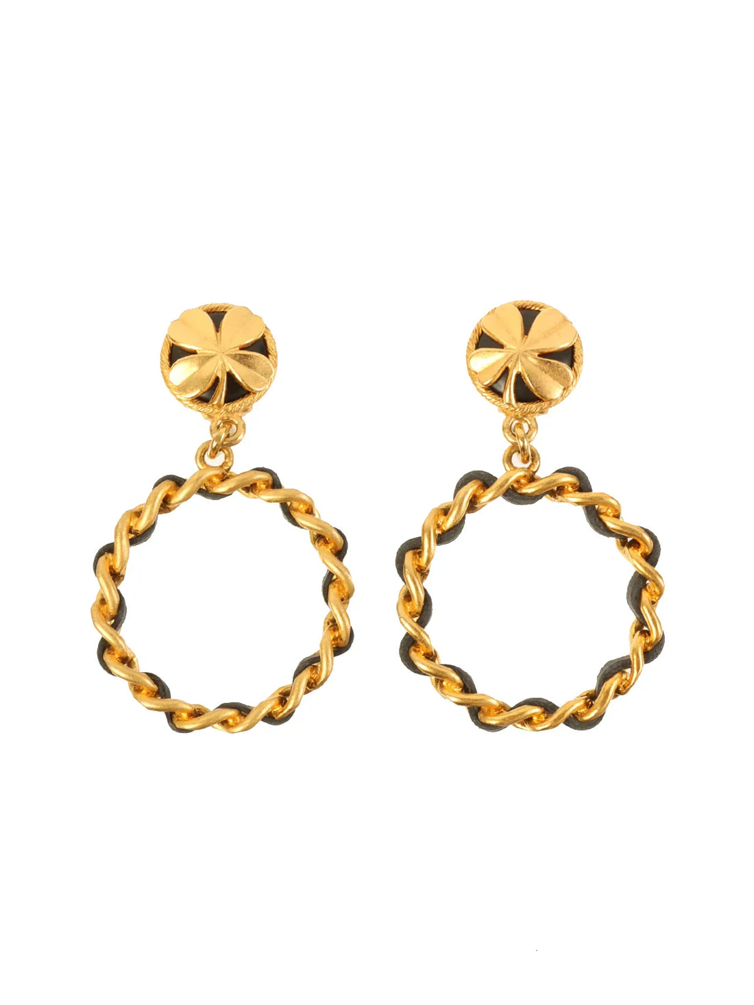 CHANEL 1994 Made Round Clover Hoop Swing Earrings Gold/Black