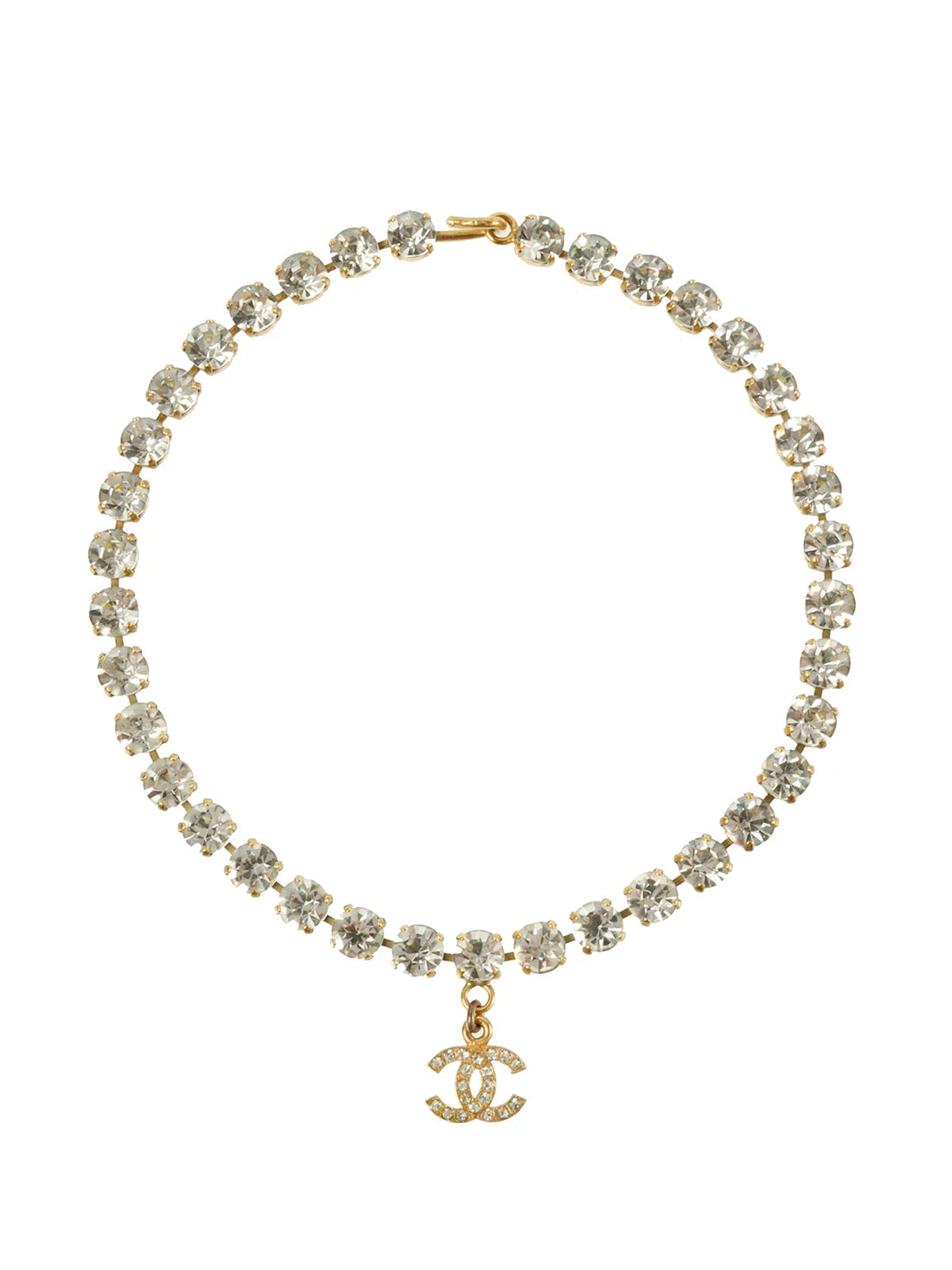 CHANEL 1995 Made Rhinestone Cc Mark Swing Necklace Gold