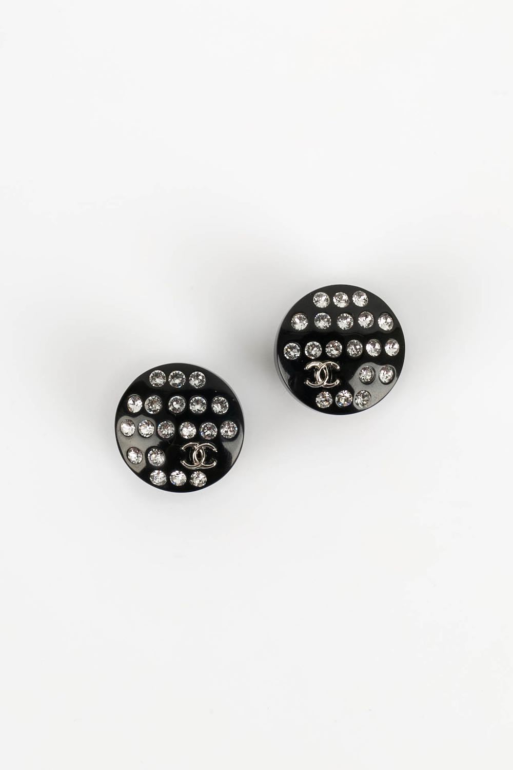 CHANEL - Boucles d'oreilles en r�sine noire et strass. Bijou de d�fil� non sign�, issu...