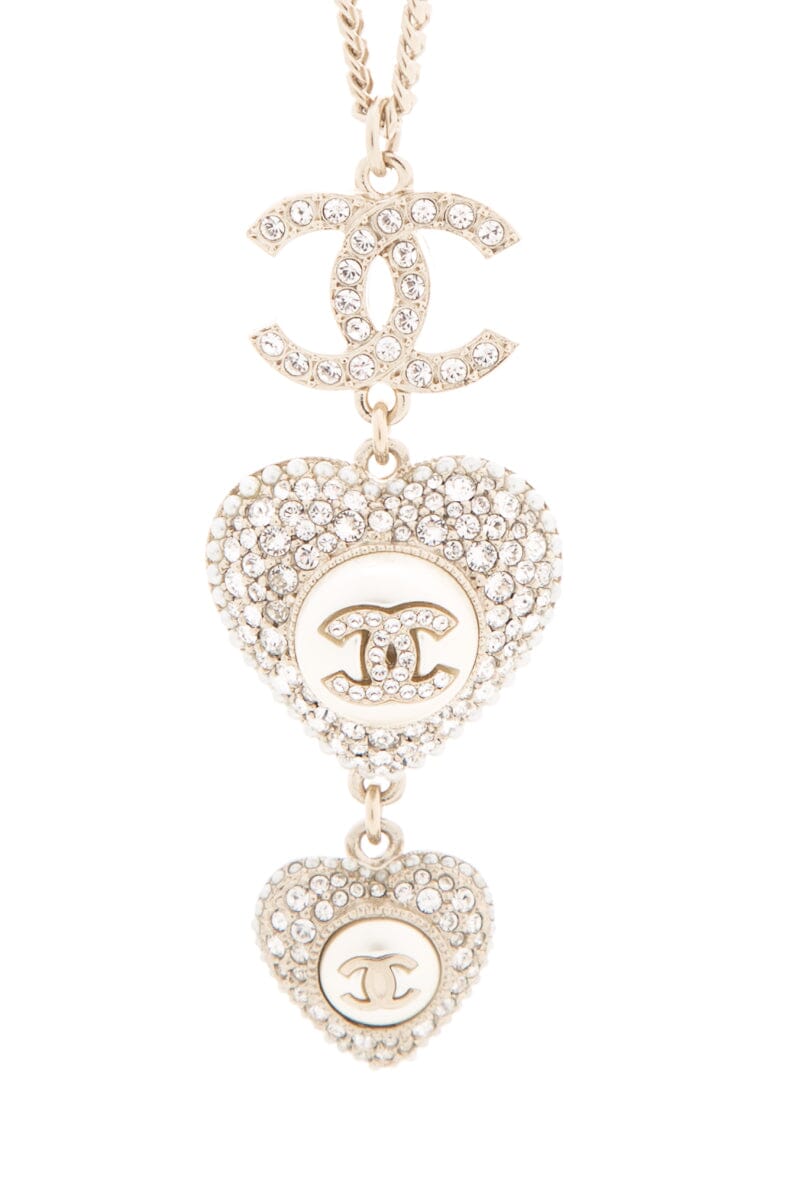 Chanel 2022 Long Gold Necklace with CC and Heart Crystal Pendants. This item is in...