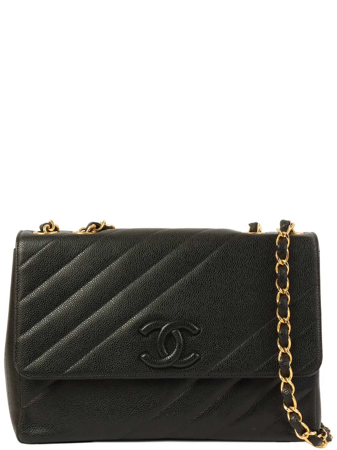 CHANEL Around 1995 Made Caviar Skin Cc Mark Diagonal Stitch Chain Bag BlackMeasurements: H 21cm...