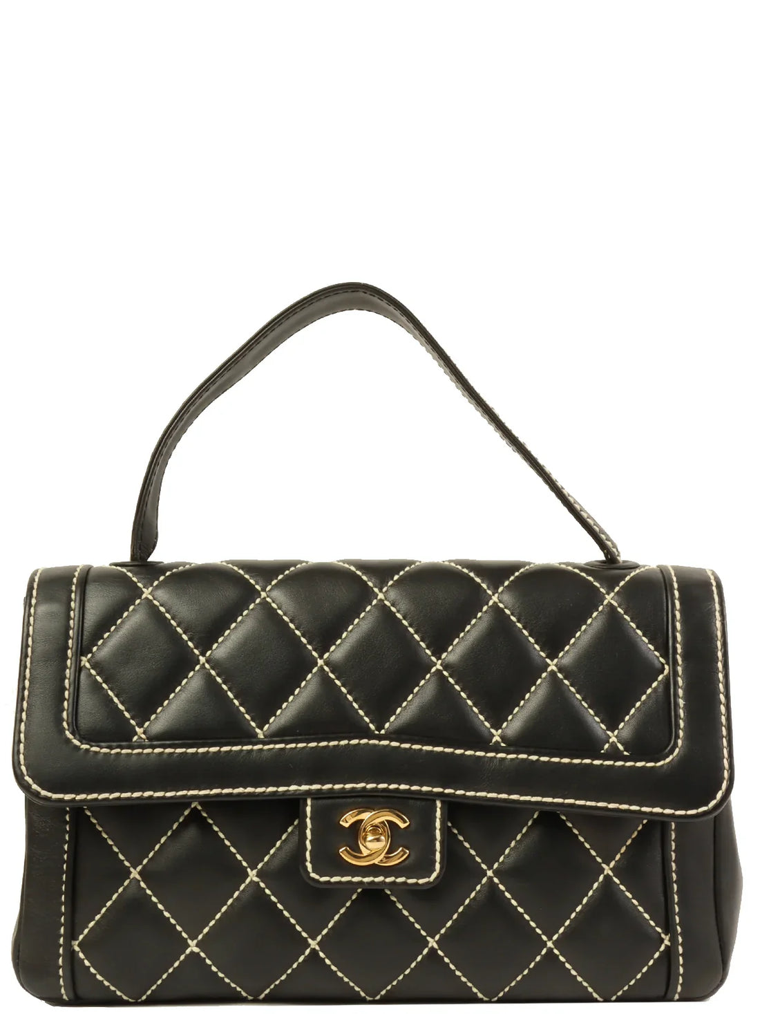 CHANEL Around 2004 Made Wild Stitch Turn-Lock Top Handle Bag BlackMeasurements: H 15cm W 25cm...