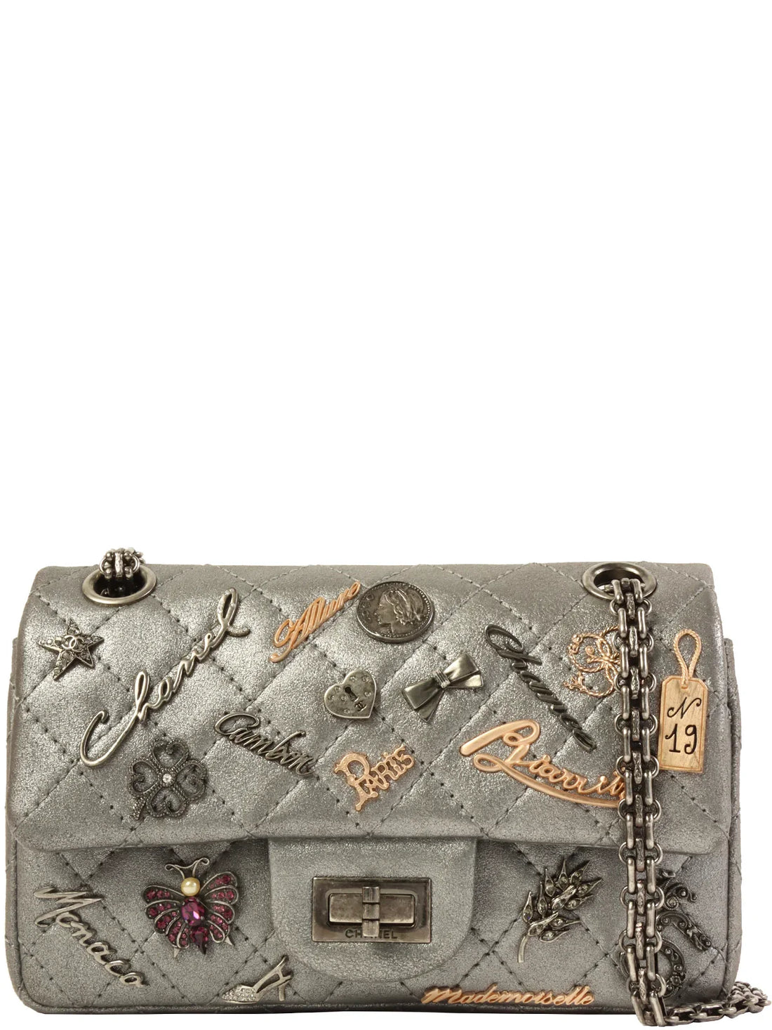 CHANEL Around 2007 Made 2.55 Icon Charm Chain Bag Mini Metallic SilverMeasurements: H 12cm W...