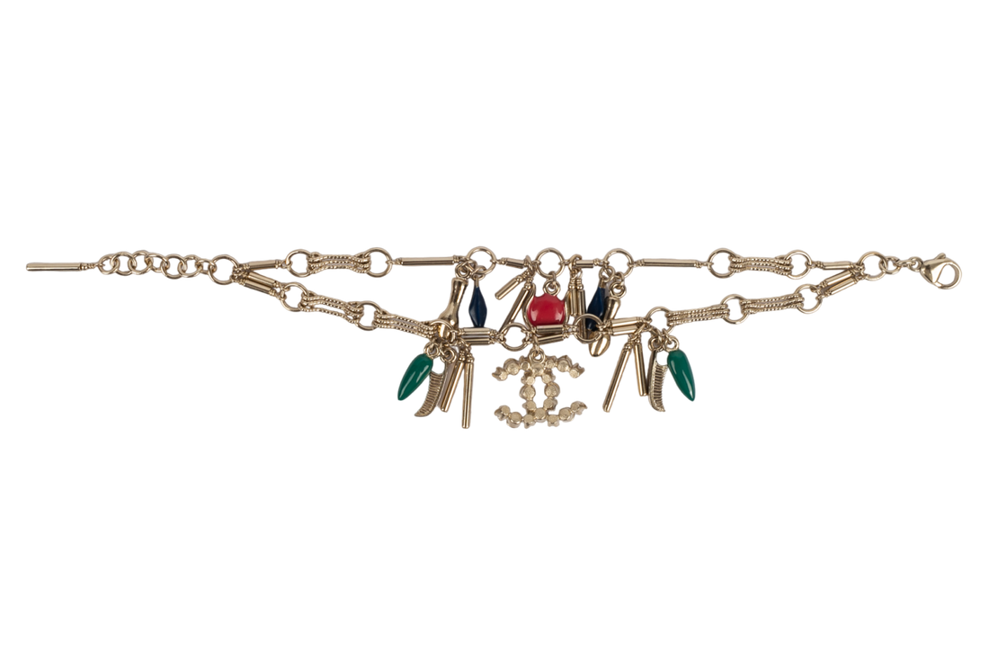 CHANEL - Bracelet en m�tal champagne et breloque en r�sine multicolore. Bijou de d�fil�, non...