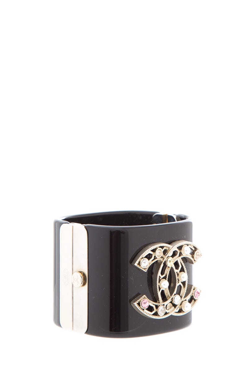 Chanel Black Cuff with Jewel Details; AS-Is Missing 2 stones.Opening: 2.25" x 2.1"Width: 2" Brand...