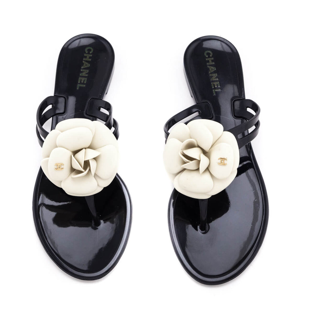 Chanel Black & Ivory Camellia Jelly Sandals Size US 8 | EU 38