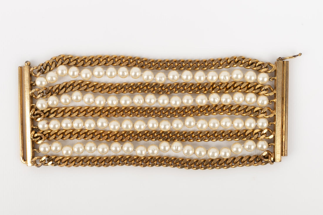 CHANEL - Large bracelet en m�tal dor� et perles nacr�es fantaisies. Condition : Tr�s bon...