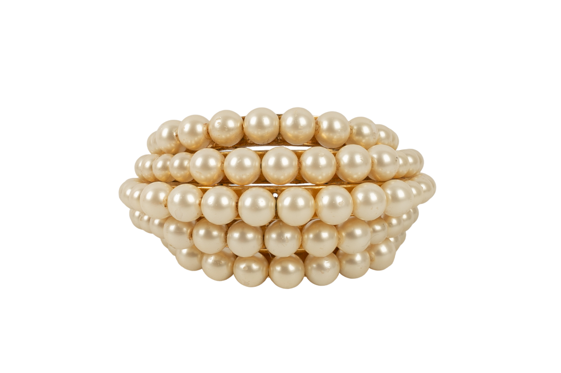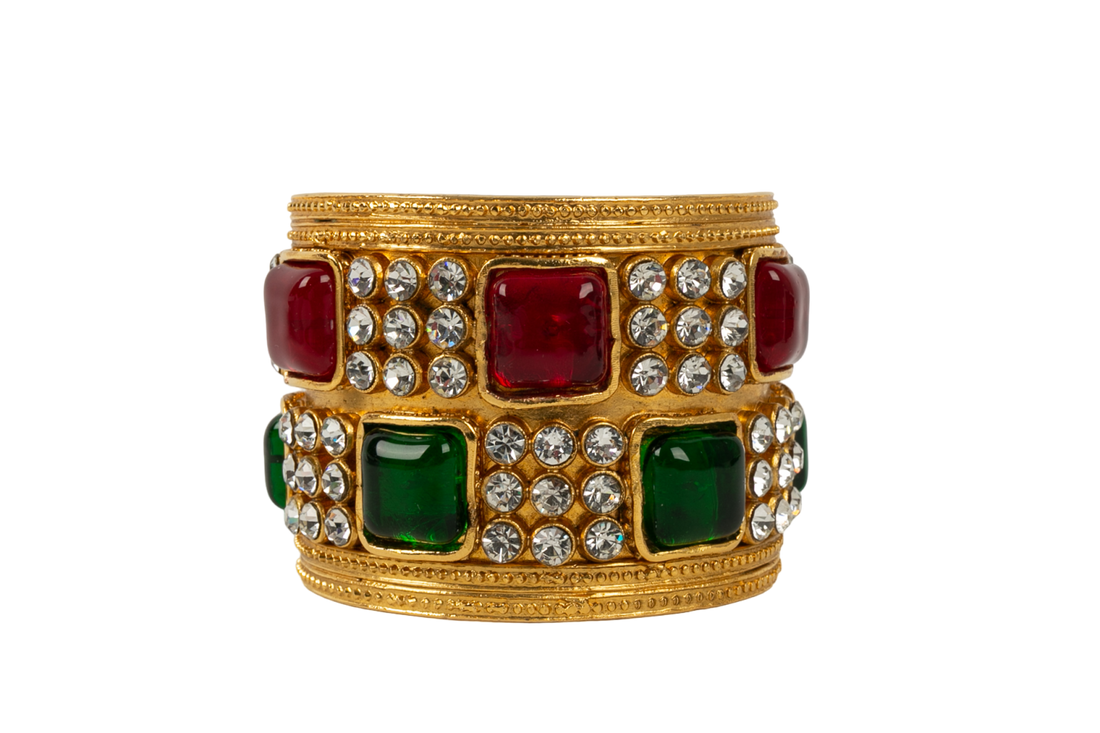 CHANEL - Bracelet manchette en m�tal dor� pav� de cabochons en p�te de verre et...