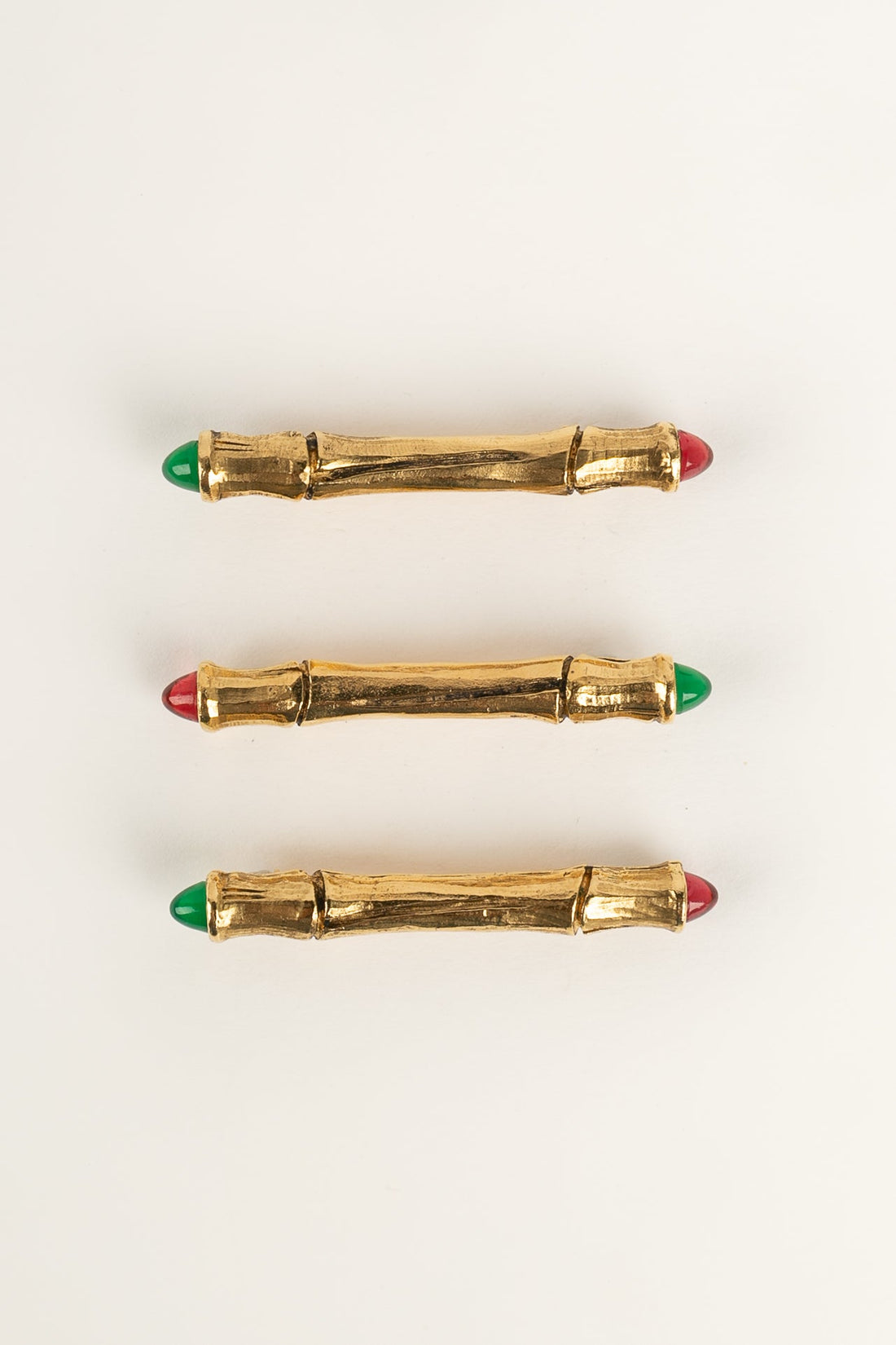 CHANEL -Ensemble de trois broches en m�tal dor� et p�te de verre rouge et verte....
