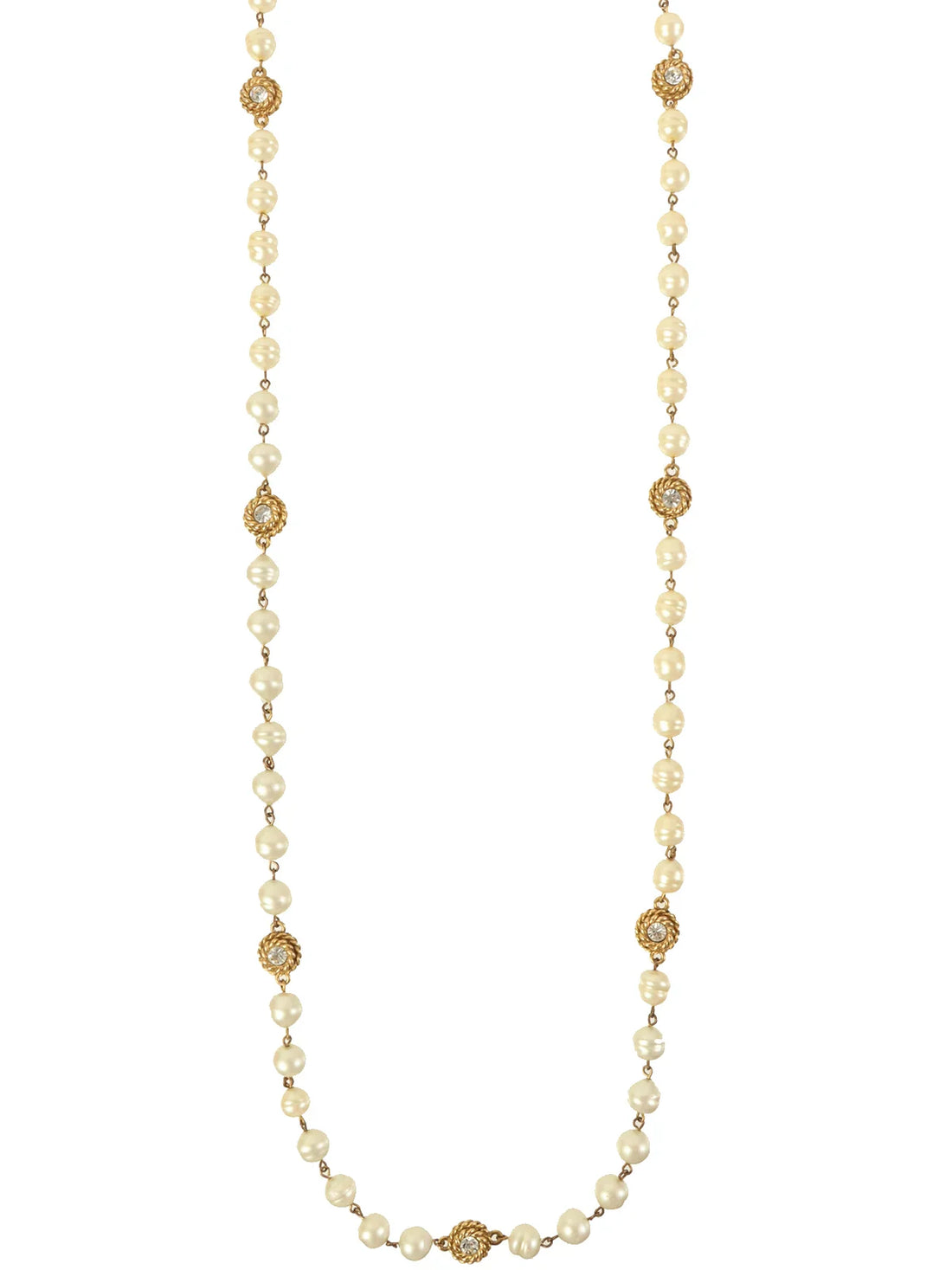 CHANEL Pearl Rhinestone Round Cc Mark Plate Long Necklace Gold/White