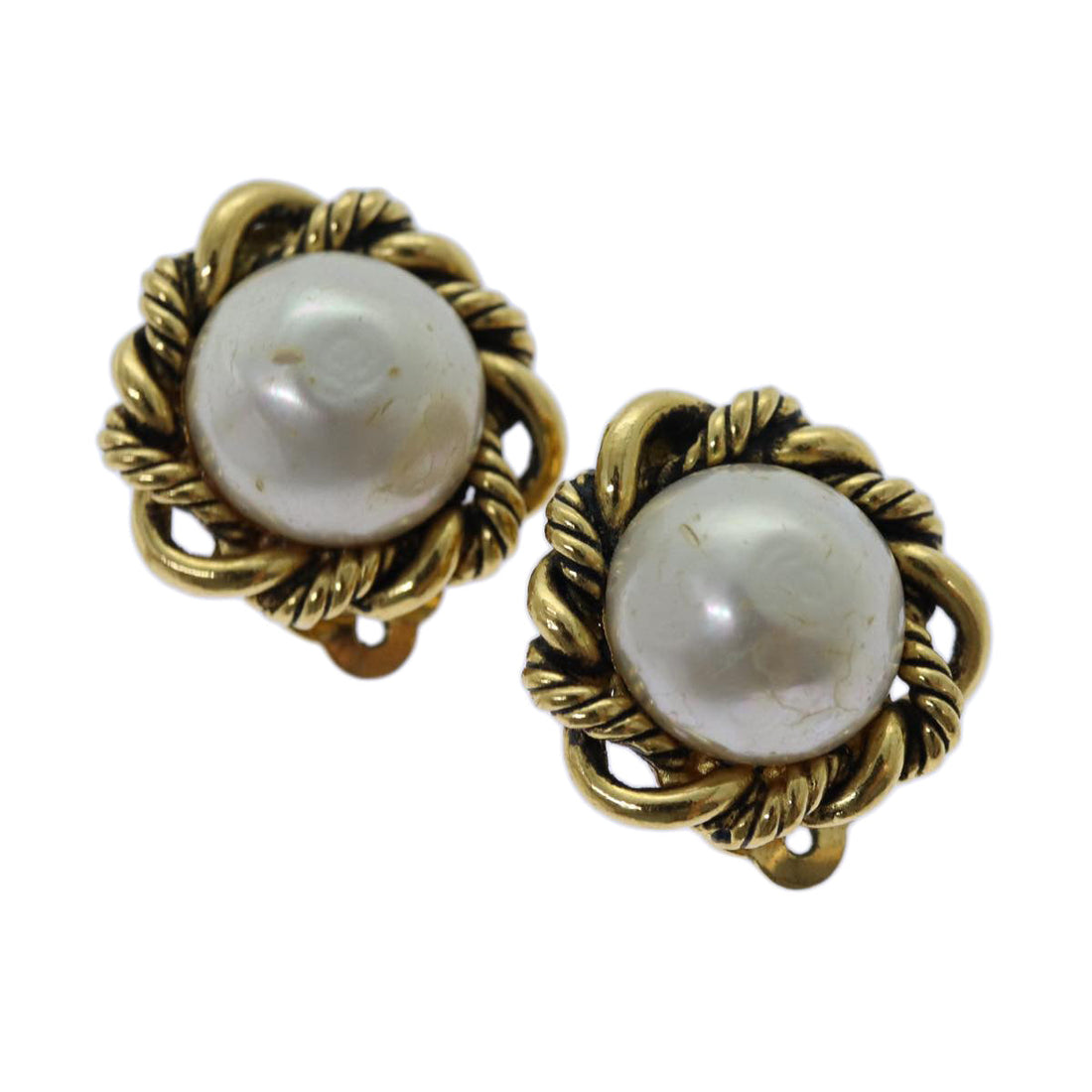 CHANEL Pearl Earring metal Gold CC Auth bs13495