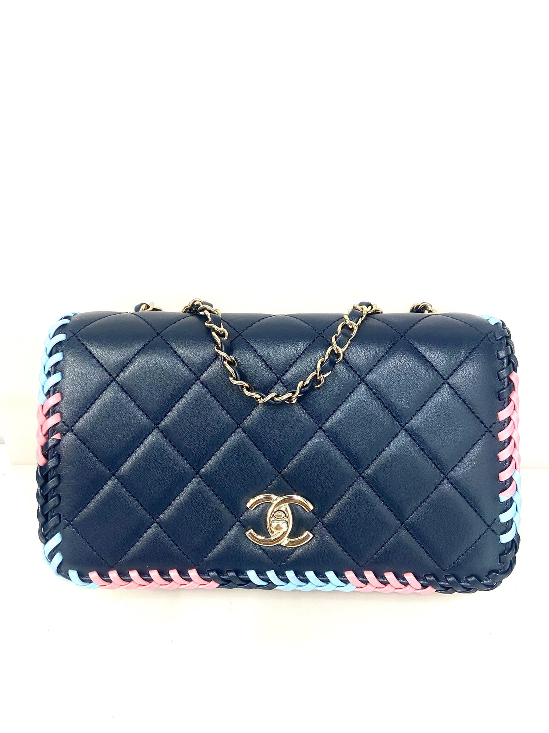 CHANEL QUILTED LAMBSKIN BRAIDED TRIM FLAP BAG-EXCELLENT CONDITIONULTRA RARE STYLE Lambskin & Gold Metal Navy Blue,...
