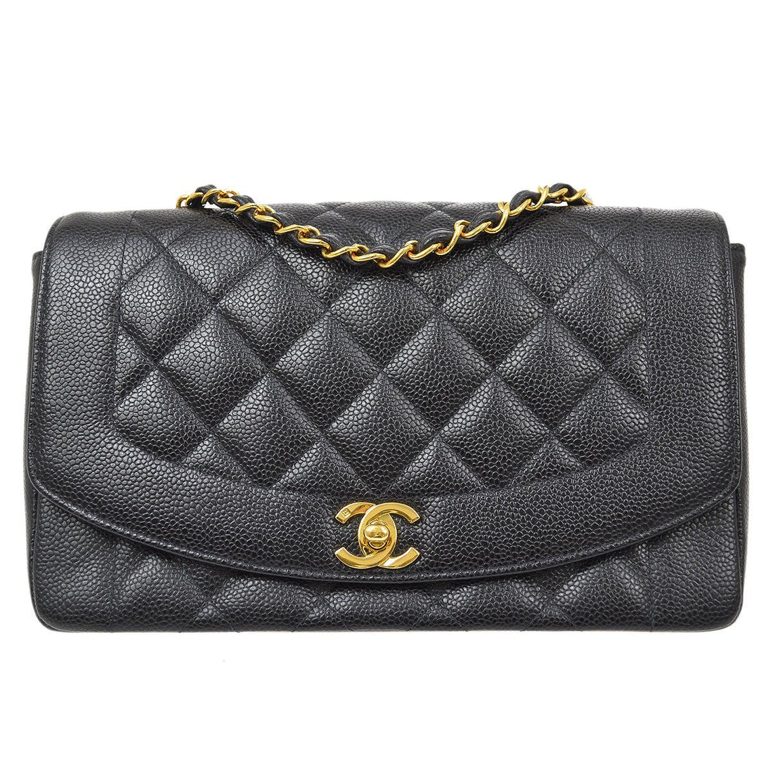 CHANEL Medium Diana Chain Shoulder Bag Black Caviar Skin Engraved / number : 3285764 Pocket...