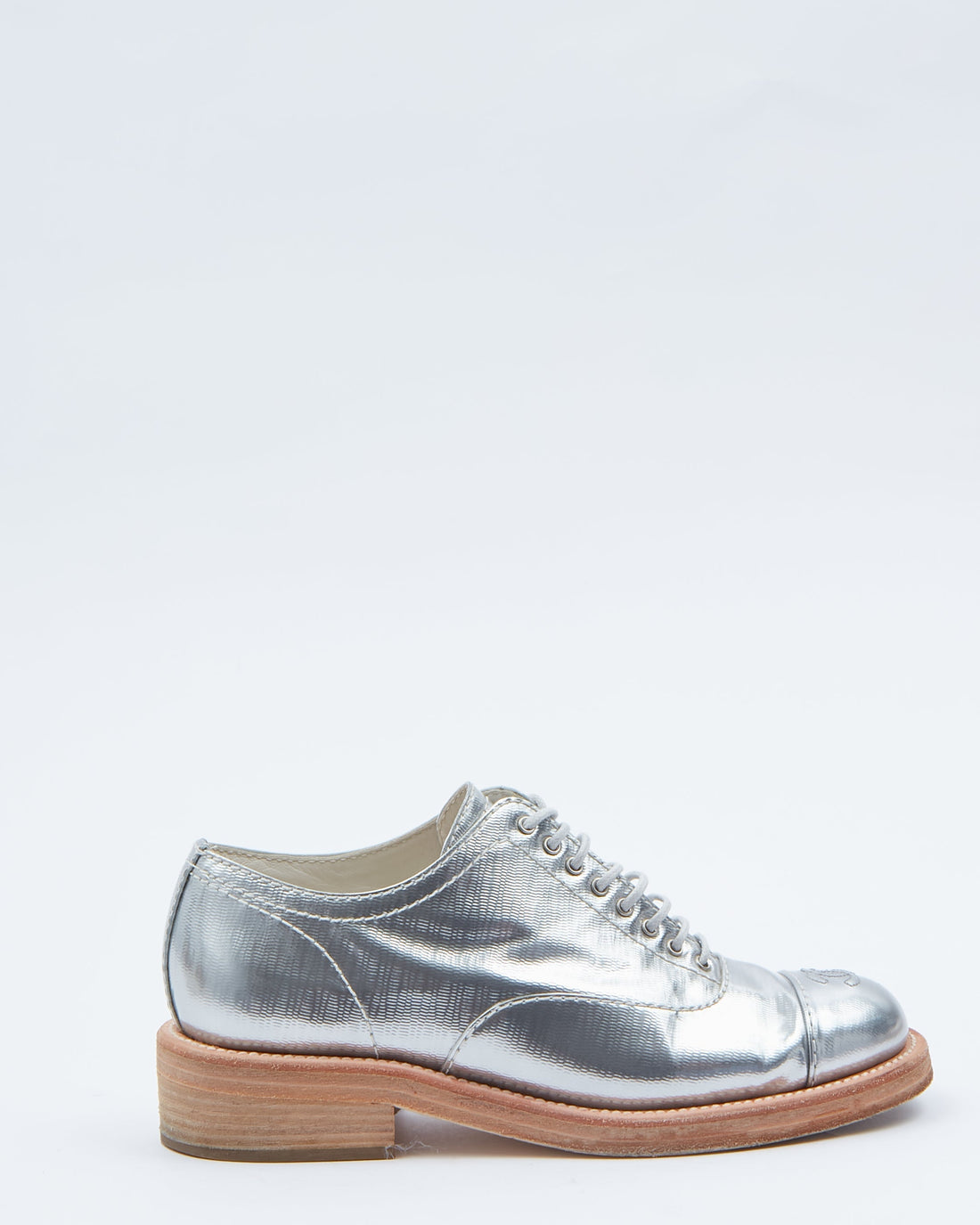 Chanel Silver Interlocking CC Logo Patent Leather Oxfords Shoe - 37.5