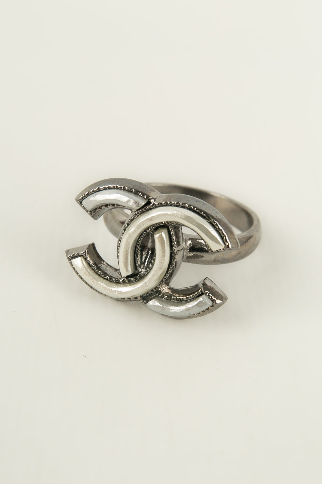 CHANEL -Bague en m�tal argent� surmont�e d'un logo cc. Bijou non sign� issu des ventes...