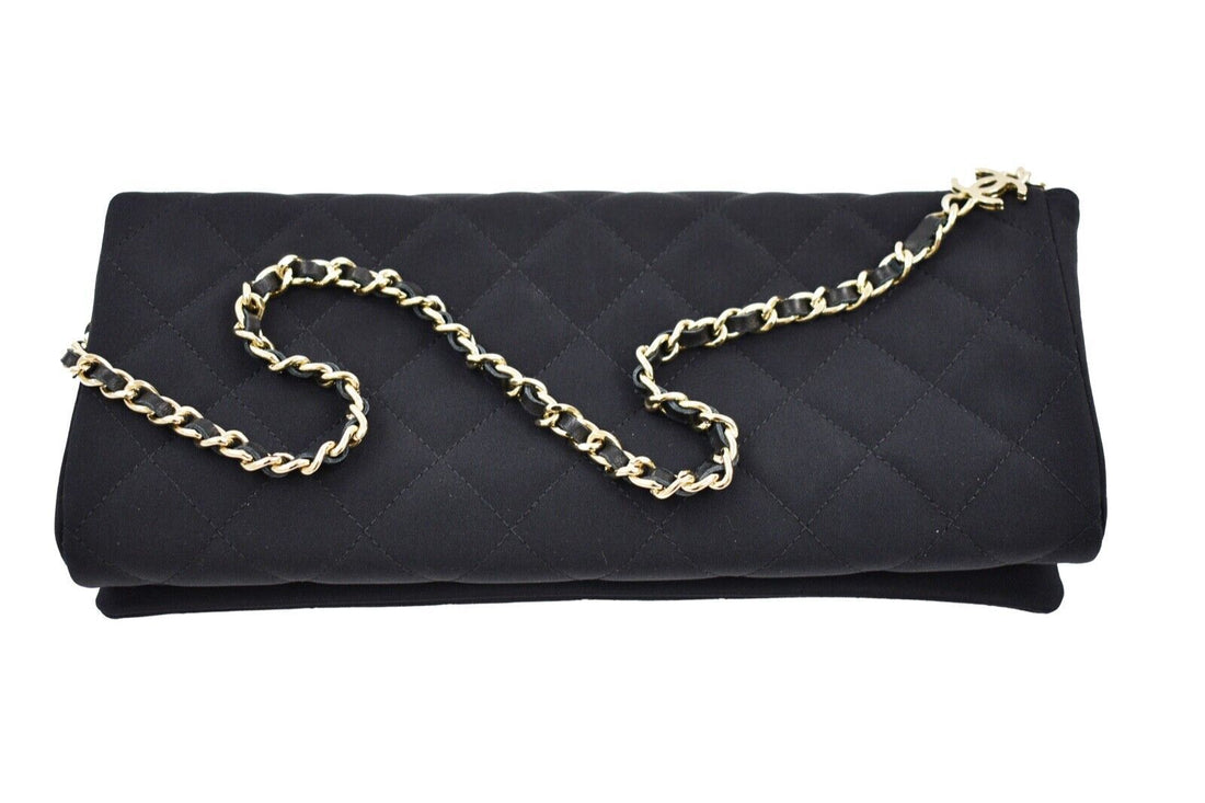 CHANEL - Camellia Black Satin Pochette Bag - Gold Chain Strap Quilted