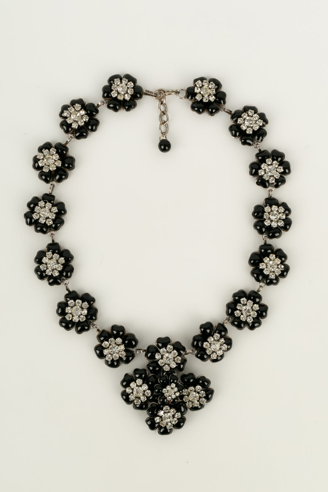 CHANEL -Collier en m�tal argent� fonc� et son pendentif cc pav� de strass de Swarovski....
