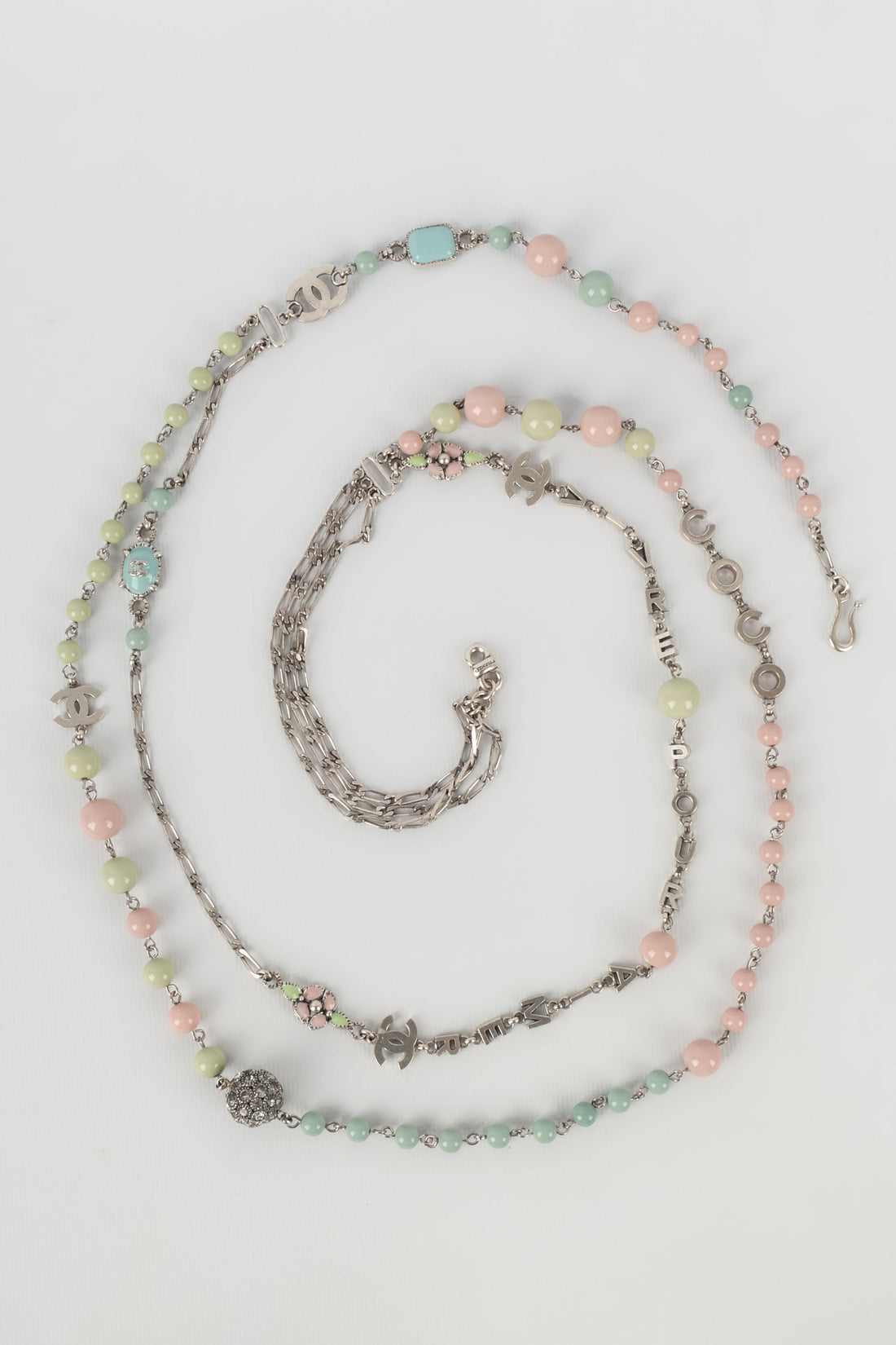CHANEL - (Made in France) Colier en métal argenté composé de deux rangs de perles...