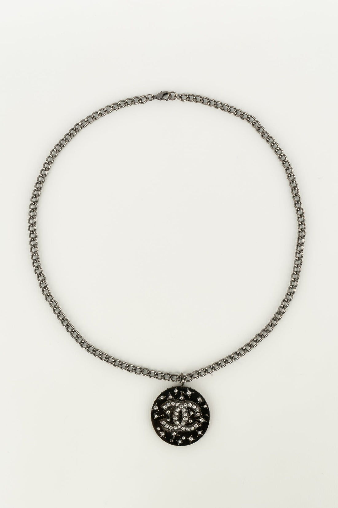 CHANEL - Collier en m�tal argent� fonc� et son pendentif cc pav� de strass de...