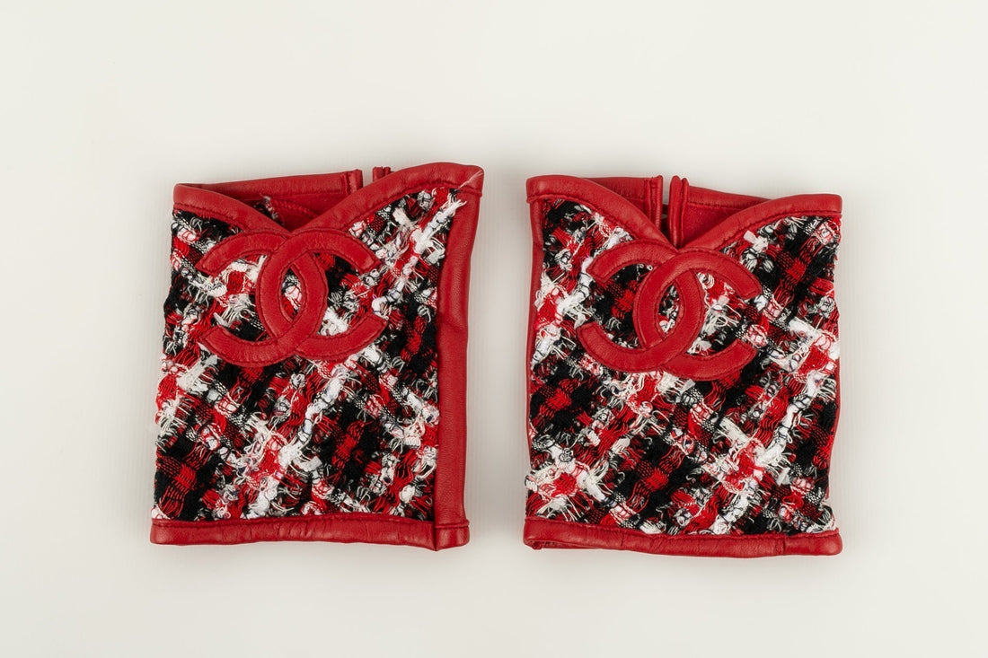 CHANEL - Mitaines en cuir rouge et tweed. Taille indiqu�e 8,5. Condition : Tr�s bon...