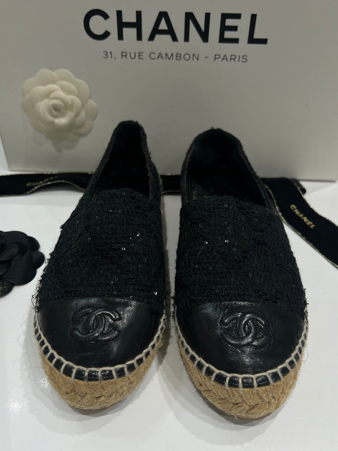 Sublimes espadrilles en tweed et sequins noirs, bout cuir, superbe état et toujours très tendance. ...