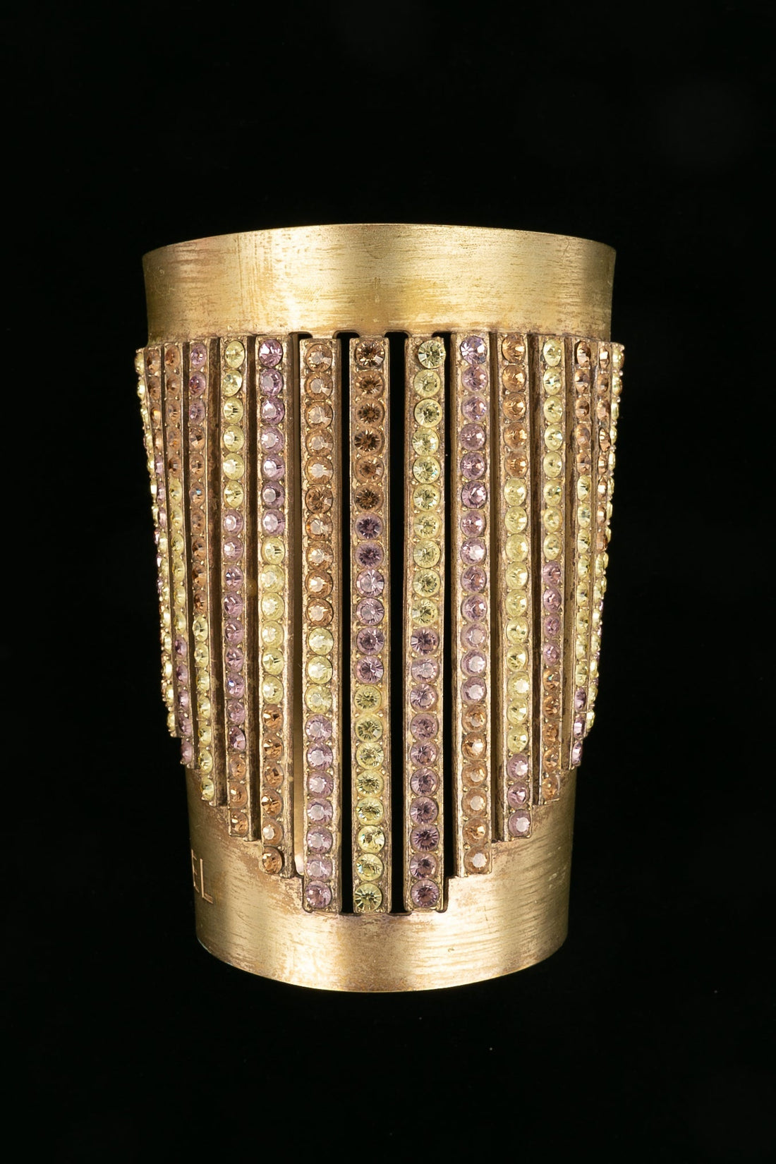 CHANEL -Bracelet manchette en m�tal dor� pav� de strass multicolores. Condition : Bon �tat Dimensions...