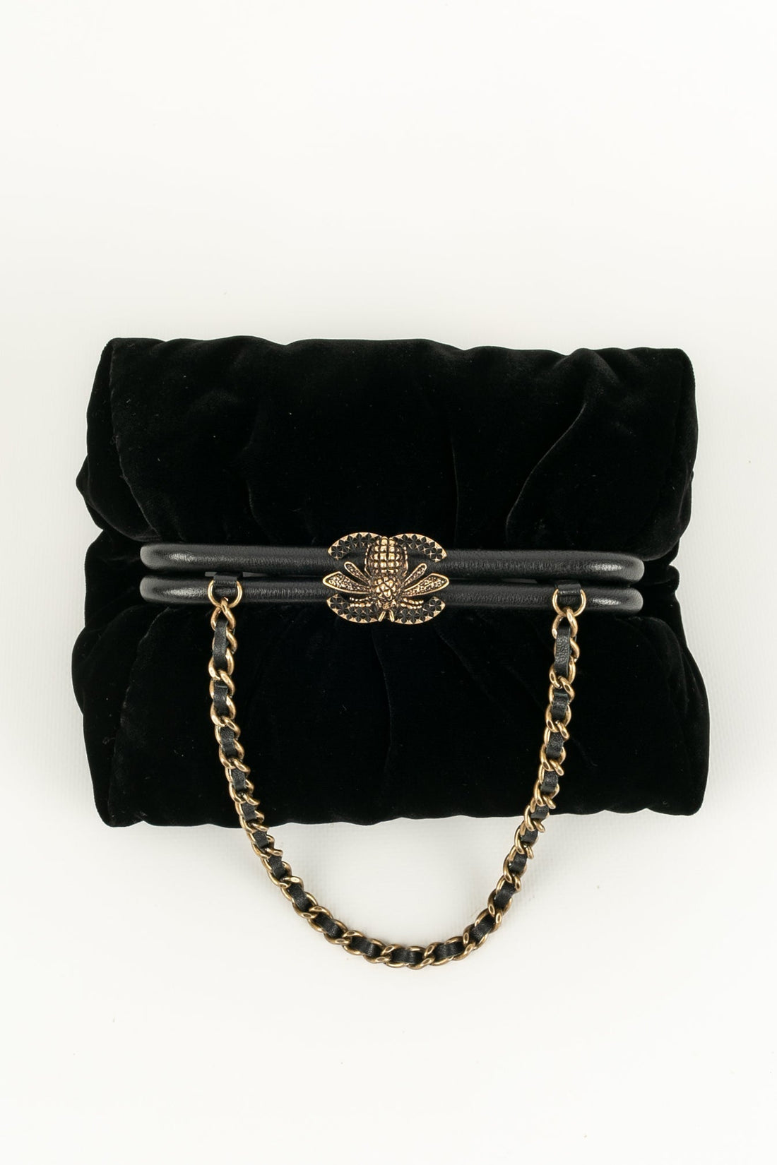 CHANEL -(Made in Italy) Minaudi�re en velours et cuir noir, attributs en m�tal dor� fonc�....