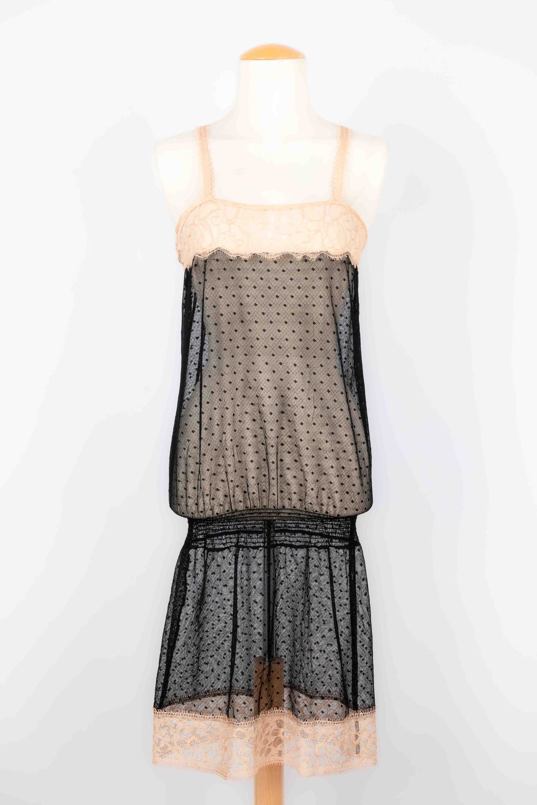 CHANEL - Robe style nuisette en mousseline de soie noire et dentelle beige. Fond de...