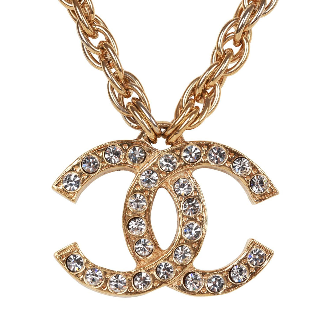 This Chanel Vintage Gold Necklace features a statement interlocking CC logo pendant with faux crystals,...