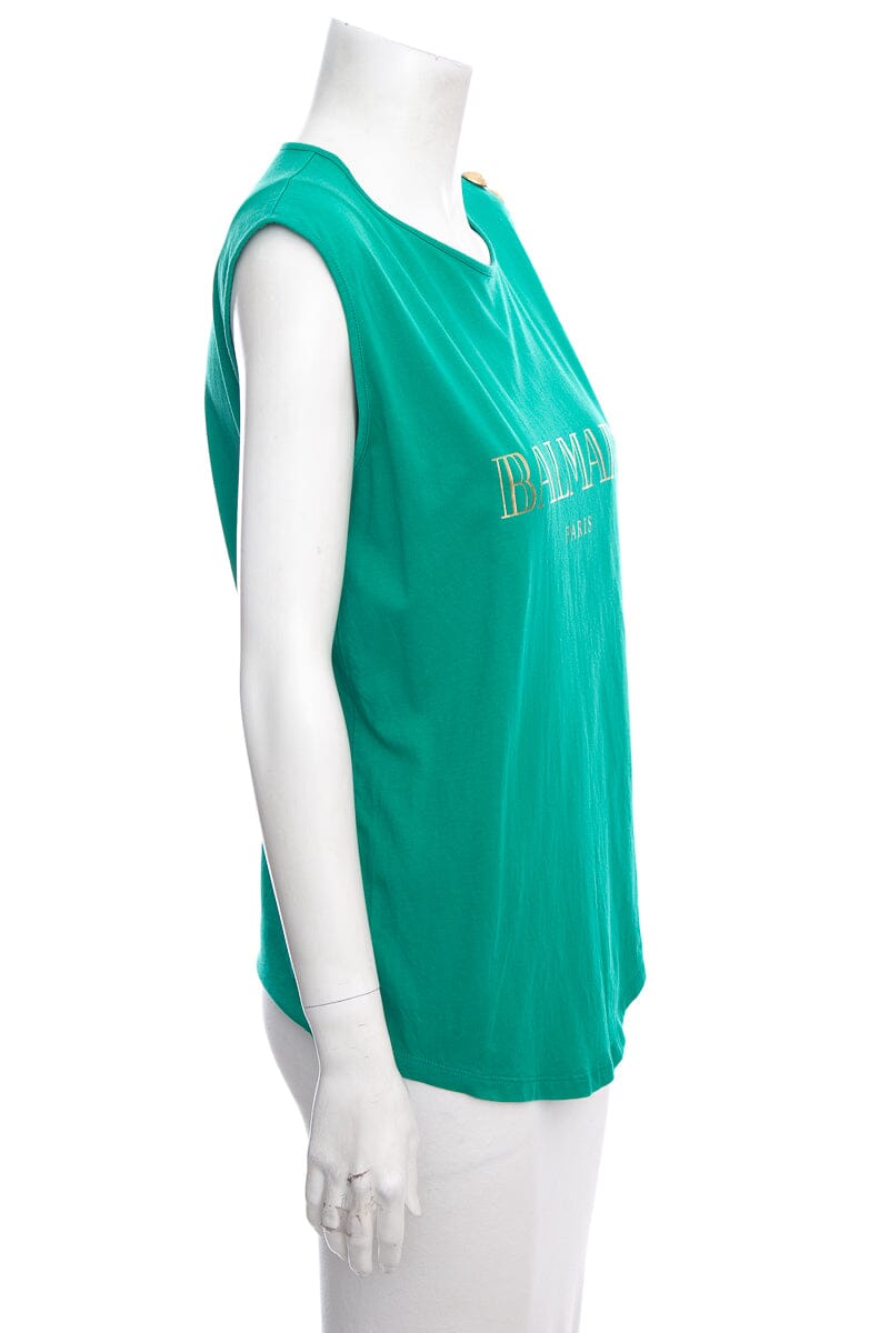 Balmain Green Tank with Gold Button Shoulder Detail. This item is gently loved; small holes...