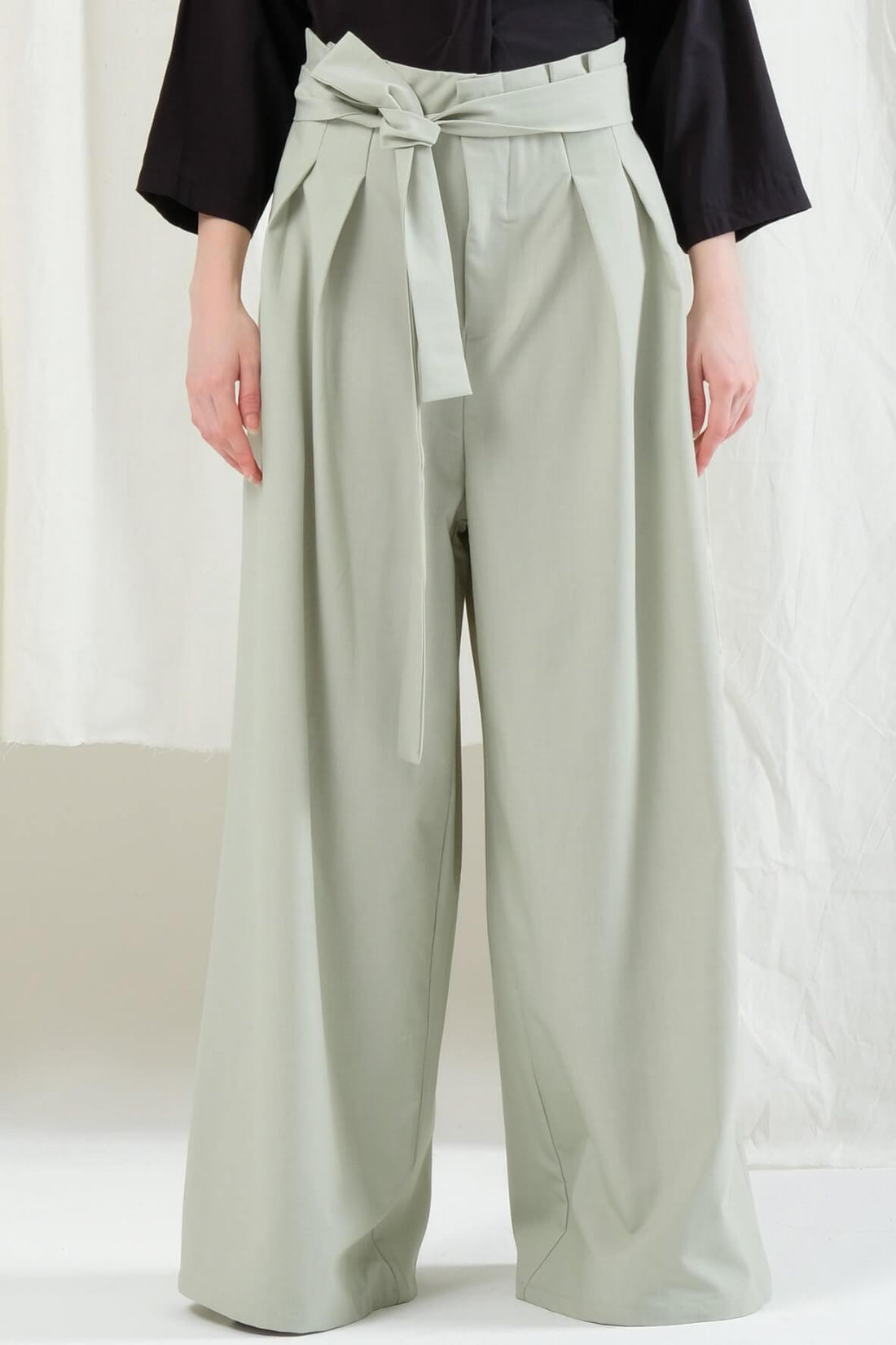 Description The Caspian Pants in the muted colour of 'laurel' are wide-legged with a paperbag...