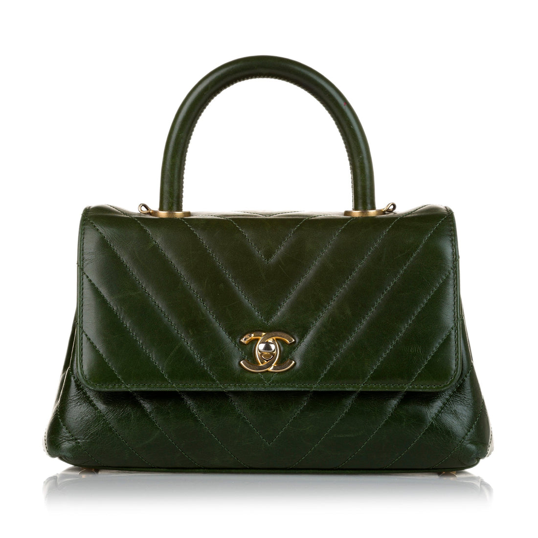 Chanel Model: Coco Top Handle Chevron Color: Military Green Khaki This flap bag features a quilted...