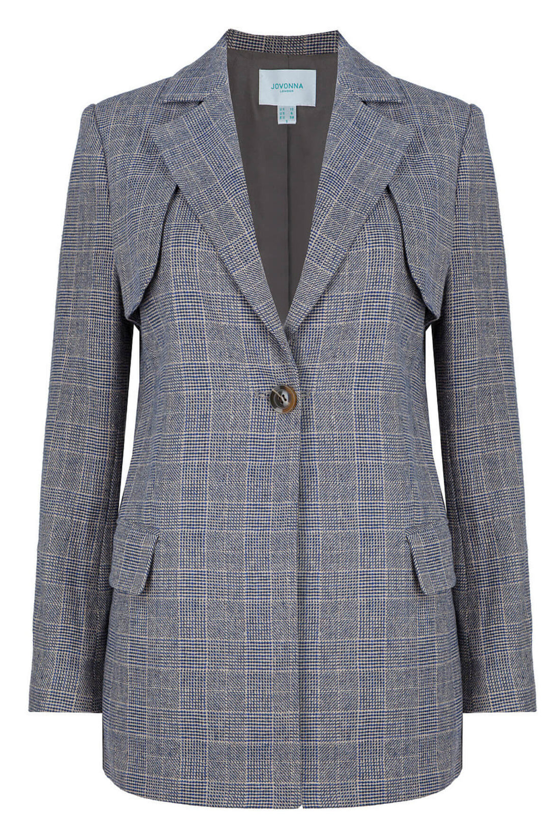 Description The grey checked blazer has notched lapels, a single button fastening, long sleeves, flap...