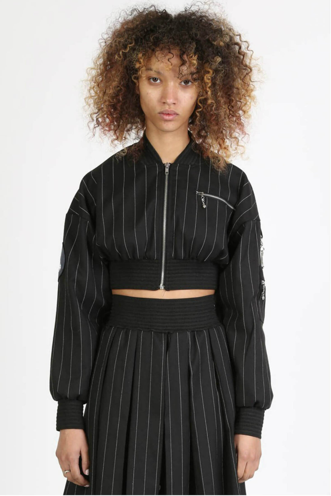 Description A pinstripe cropped bomber with a circle "Boy" applique patch on the arm. Featuring...