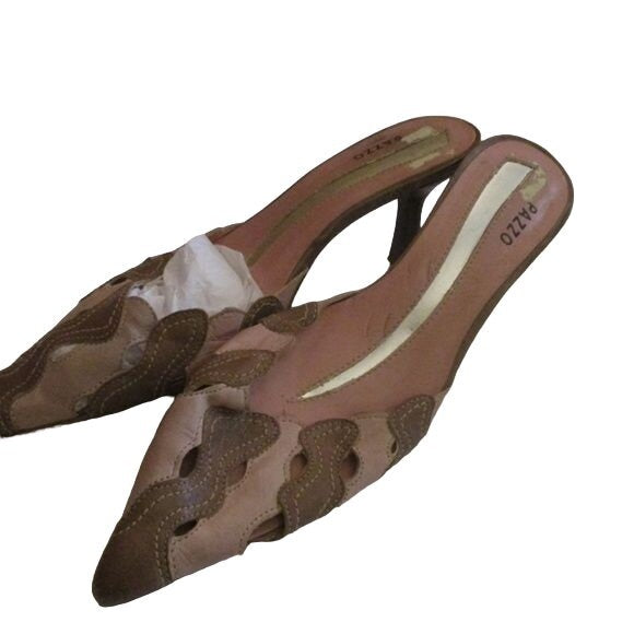 For sale is a pair of vintage pink and taupe Pazzo suede pointed toe slides...